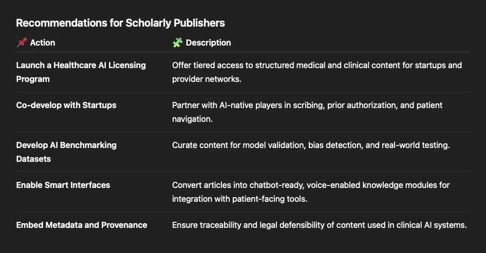 Just like entertainment firms license IP to game or video producers, publishers should offer targeted licensing for healthcare AI companies—especially in clinical reasoning, diagnostics, coding, and care coordination.