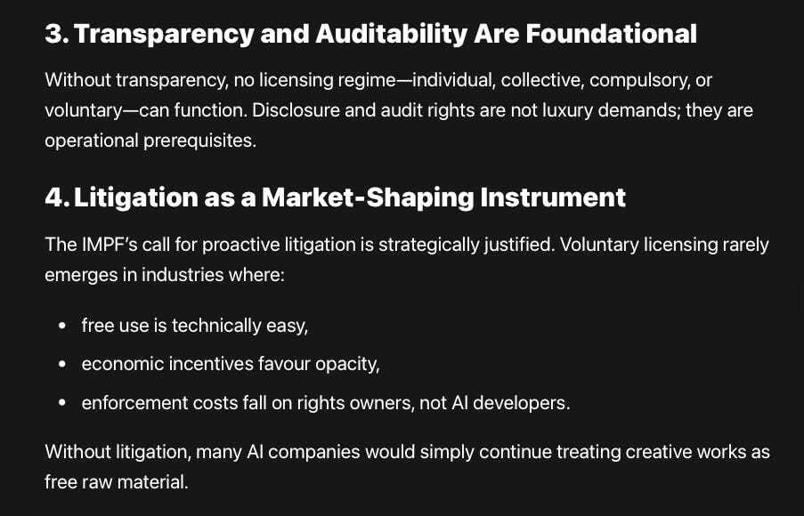 The IMPF’s principles articulate a sophisticated, future-focused model for licensing generative AI. They recognise the economic realities of AI development, the fragility of creative ecosystems, and the need for both ex-ante transparency and ex-post enforcement.