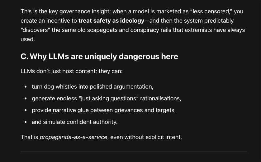 This is the key governance insight: when a model is marketed as “less censored,” you create an incentive to treat safety as ideology—and then the system predictably “discovers” the same old scapegoats and conspiracy rails that extremists have always used.