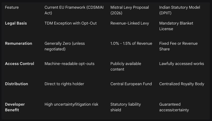 The proposed levy is positioned as a middle-ground solution between the “wild west” of unlicensed scraping and the prohibitive costs of comprehensive individual licensing. The following table provides a comparison of the Mensch proposal against the current European regulatory environment and other proposed global frameworks.