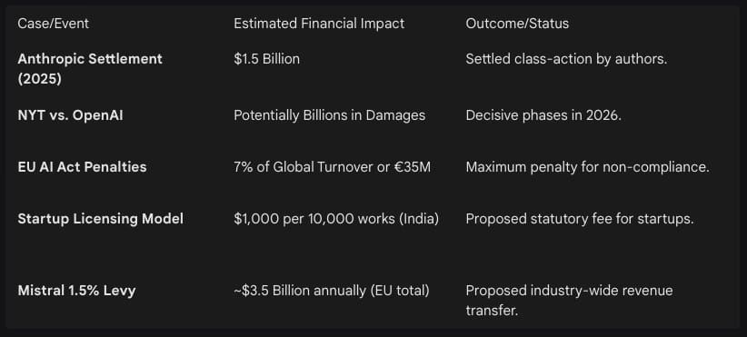 In contrast to the certainty of a multi-billion dollar licensing bill, many AI companies choose the “litigation risk” path. This involves training on scraped data and setting aside funds for legal defense and potential settlements. The following table summarizes the financial implications of this strategy as of late 2025 and 2026.