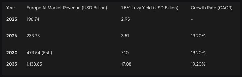 The implementation of a 1.5% levy on the European AI market would have a significant financial impact. The AI market in Europe is currently experiencing rapid growth, driven by the adoption of generative AI across sectors like healthcare, finance, and manufacturing.17