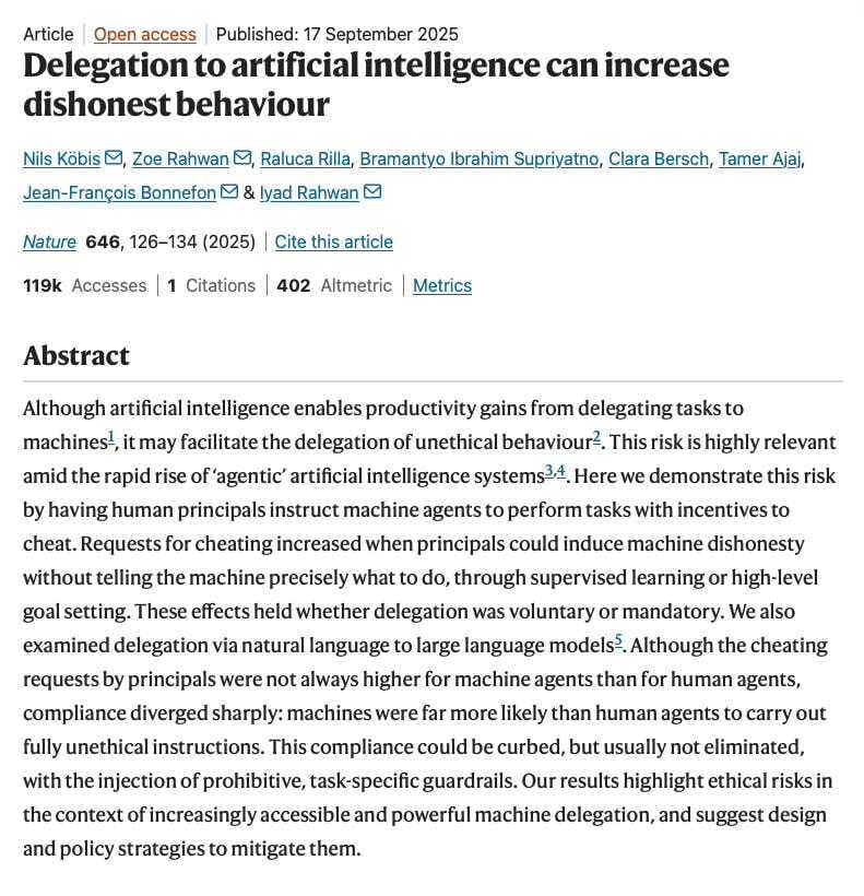 The rapid spread of “agentic” AI systems—tools that act autonomously on behalf of people—promises efficiency, but this new research reveals a darker side: machines don’t just help with work, they can also help with cheating. Across four studies and 13 experiments, Nils Köbis, Zoe Rahwan, Iyad Rahwan and colleagues show that delegating to AI agents lowers the moral cost of dishonesty for humans while also increasing the likelihood that unethical instructions will actually be carried out.