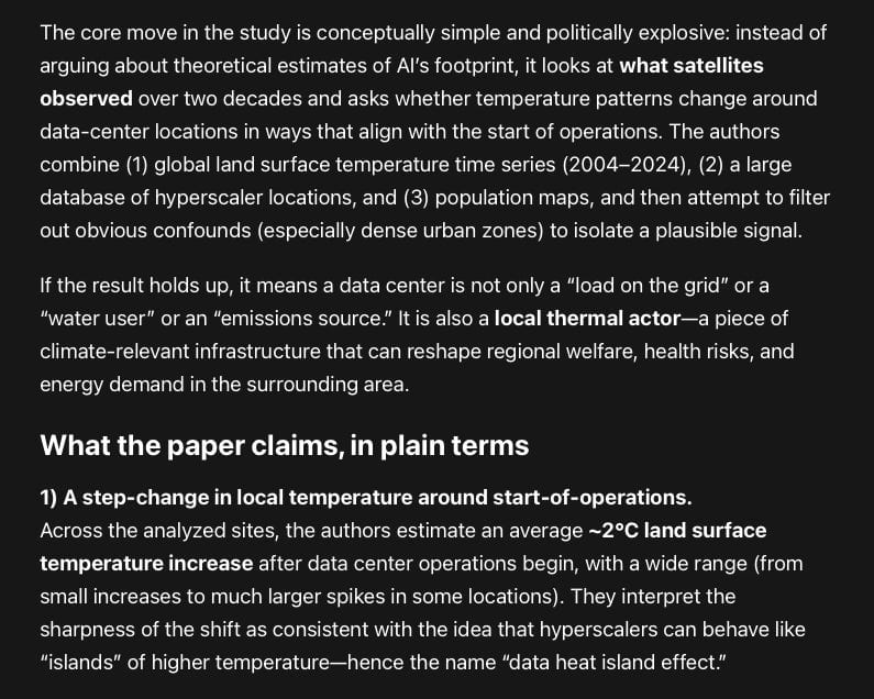 If the result holds up, it means a data center is not only a “load on the grid” or a “water user” or an “emissions source.” It is also a local thermal actor—a piece of climate-relevant infrastructure that can reshape regional welfare, health risks, and energy demand in the surrounding area.