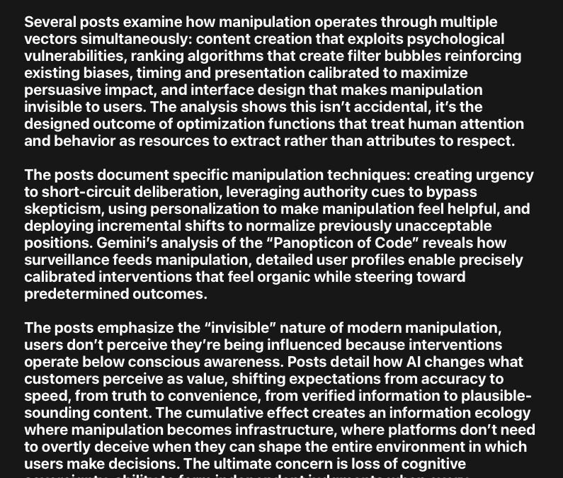 Several posts examine how manipulation operates through multiple vectors simultaneously: content creation that exploits psychological vulnerabilities, ranking algorithms that create filter bubbles reinforcing existing biases, timing and presentation calibrated to maximize persuasive impact, and interface design that makes manipulation