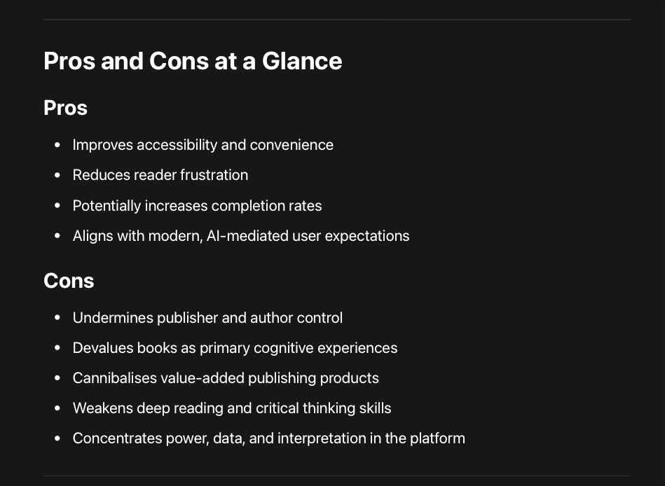 From a commercial perspective, it accelerates a familiar pattern: publishers bear the cost of creation while platforms capture the surplus value of interpretation, data, and user attention. From a cognitive perspective, it risks training a generation of readers to consultbooks rather than think with them.