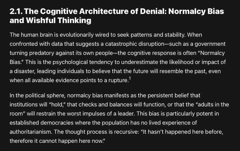The human brain is evolutionarily wired to seek patterns and stability. When confronted with data that suggests a catastrophic disruption—such as a government turning predatory against its own people—the cognitive response is often “Normalcy Bias.” This is the psychological tendency to underestimate the likelihood or impact of a disaster, leading individuals to believe that the future will resemble the past, even when all available evidence points to a rupture.1