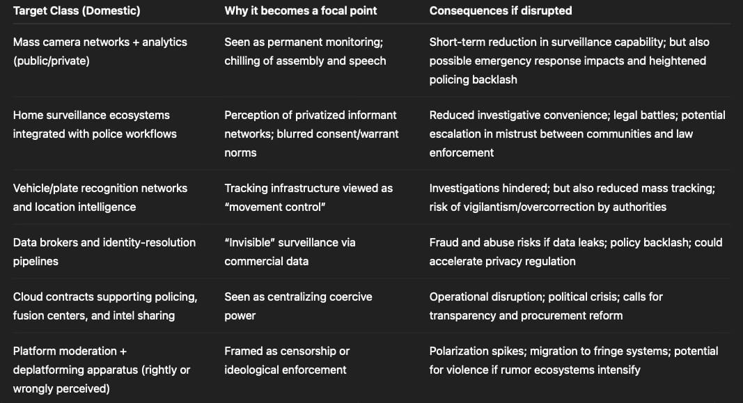 You asked to emphasize the internal front: resistance to domestic surveillance, policing, and techno-authoritarian drift. This matters because it creates a second axis of targeting logic—one rooted not in interstate war but in legitimacy conflict between state-aligned tech and portions of the governed.