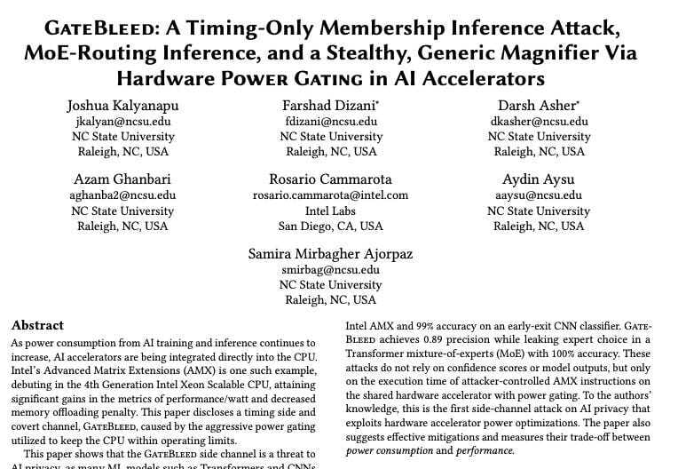 GateBleed exploits the behavior of AI accelerators—specifically, the timing delays introduced by power gating optimizations in Intel’s AMX hardware. These accelerators are designed to conserve energy by powering off unused components and waking them up when needed. However, this wake-up process introduces measurable latency, which varies depending on how recently the component was used. Attackers can exploit these latency variations to infer sensitive information, including: