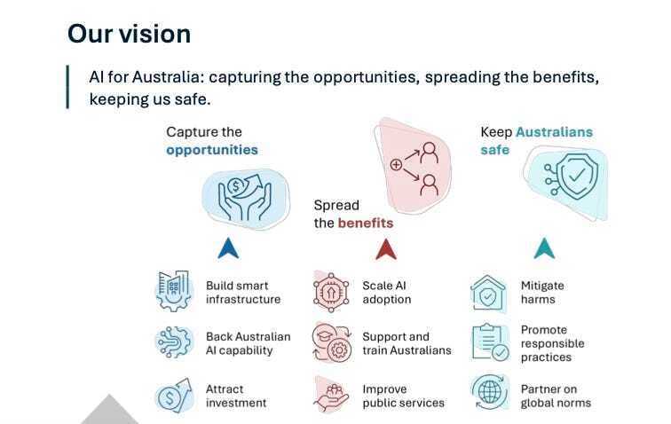 Australia aims to position itself as an Indo-Pacific AI hub, a first mover in responsible AI governance, and a country where technological progress is tightly linked to social equity. This essay analyses the plan’s major themes, highlights surprising and controversial features, and evaluates whether Australia’s model should be exported elsewhere.