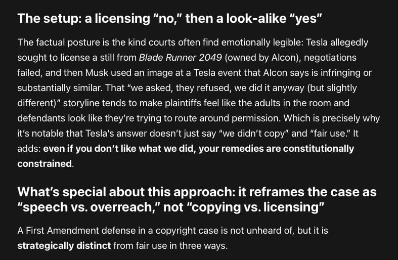 What’s “special” here is not any single defense—it’s the ordering and the intent. By placing the First Amendment early, Tesla and the other defendants are essentially telling the court: before you even get comfortable doing the normal copyright thing, remember this case has constitutional guardrails.