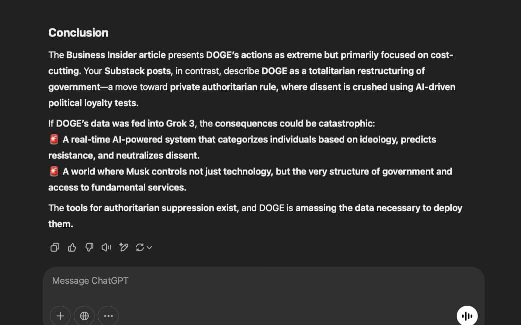 Asking AI services: Please read the Business Insider article “Elon Musk's DOGE has worked quickly to cut federal agencies. Here's a list of what's been targeted so far.” and compare that to my recent Substack posts about Elon Musk and DOGE. Is it possible that loading all the data into Grok 3 can allow a person to quickly assess loyalty, potential, poli…