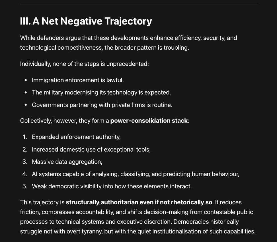 The convergence of ICE enforcement escalation, militarised domestic authority, and frontier AI integration marks a quiet but profound shift in how power operates in the United States. While each element can be defended in isolation, their interaction produces a system that is harder to contest, harder to see, and harder to reverse.