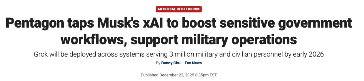 Pentagon taps Musk’s xAI to boost sensitive government workflows, support military operations — https://www.foxnews.com/politics/pentagon-taps-musks-xai-boost-sensitive-government-workflows-support-military-operations