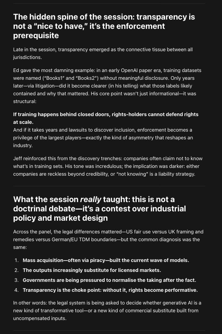 Across the panel, the legal differences mattered—US fair use versus UK framing and remedies versus German/EU TDM boundaries—but the common diagnosis was the same: