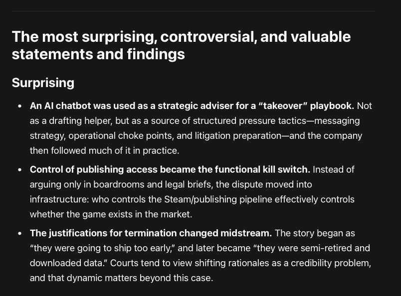 As the sequel (Subnautica 2) approached an early-access launch, internal forecasts suggested the earnout would be triggered. The relationship then deteriorated rapidly. The court found that Krafton’s leadership shifted from supporting launch execution to trying to avoid or reduce the earnout—culminating in a “Project X” internal effort to negotiate an earnout “deal” or execute a “take over.” A striking element of the record is that Krafton’s CEO consulted an AI chatbot for a “no-deal” strategy and then implemented many of the chatbot’s recommended steps: shaping a public narrative (“preemptive framing”), securing control points (including publishing access), building a litigation-ready record, and splitting tactics into “hardball” and “softball.”