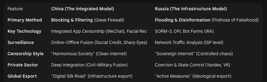 The Firehose of Falsehood: Unlike China’s focus on blocking (maintaining a “clean” internet), Russia focuses on flooding. AI bots and troll farms generate massive amounts of noise to confuse the public and erode trust in objective truth. The goal is not to convince people of a specific truth, but to convince them that no truth exists.29