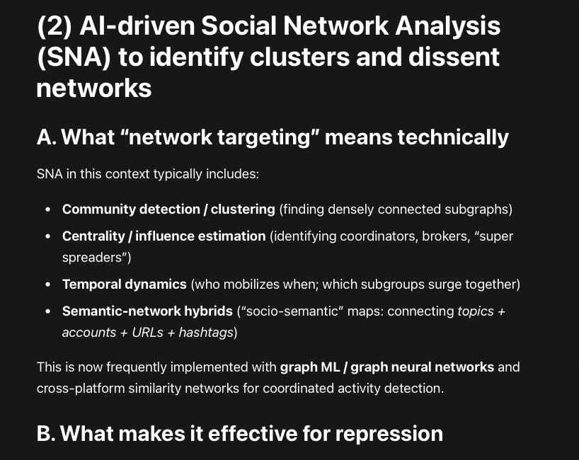 Predictive Containment: By simulating the spread of a “viral” protest post, the AI can predict which communities will be “infected” next. This allows the regime to intervene preemptively—for example, by shadowbanning the bridge nodes identified above before the information crosses the chasm to the wider public.23