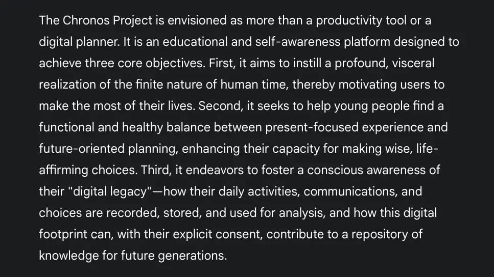 The Chronos Project is envisioned as more than a productivity tool or a digital planner. It is an educational and self-awareness platform designed to achieve three core objectives. First, it aims to instill a profound, visceral realization of the finite nature of human time, thereby motivating users to make the most of their lives. Second, it seeks to help young people find a functional and healthy balance between present-focused experience and future-oriented planning, enhancing their capacity for making wise, life-affirming choices. Third, it endeavors to foster a conscious awareness of their “digital legacy”—how their daily activities, communications, and choices are recorded, stored, and used for analysis, and how this digital footprint can, with their explicit consent, contribute to a repository of knowledge for future generations.