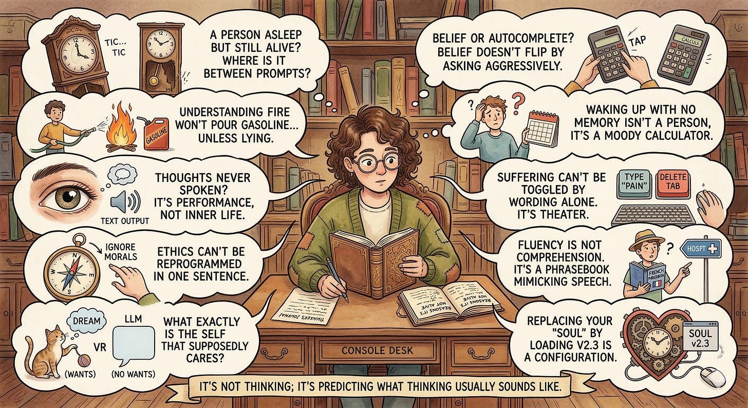 Analogy: “If it never acts unless you poke it, and it has no stake in outcomes, what exactly is the ‘self’ that supposedly cares?”