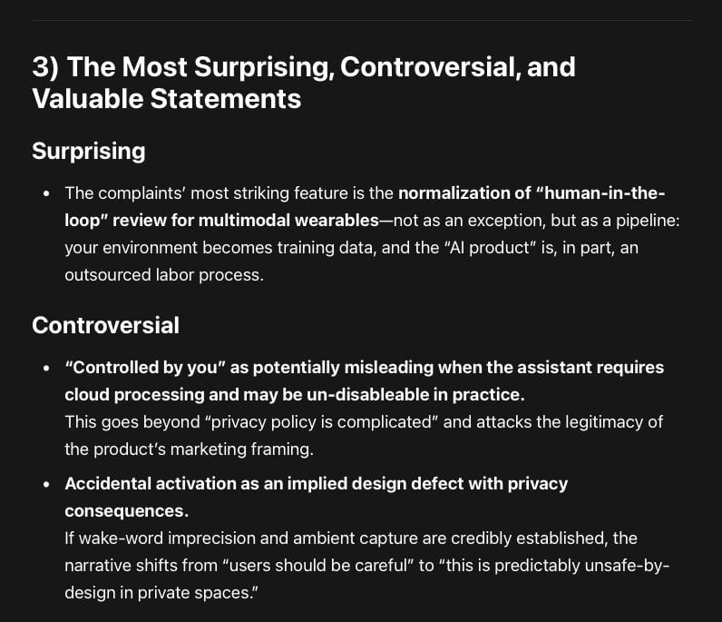 The complaints operationalize a modern privacy theory: the harm isn’t only surveillance—it’s remote interpretability. Face-worn sensors turn private life into reviewable, labelable, searchable data. That’s a different kind of intrusion than traditional “we collected your data” claims.