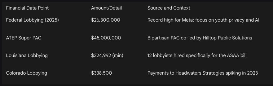 The evidence of the influence operation is supported by public IRS 990 filings, state ethics databases, and campaign finance records. Analysts have documented a massive surge in Meta’s lobbying expenditures, which reached an all-time record of $26.3 million in 2025.1