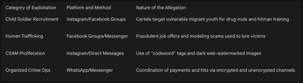 The allegations against Meta and its network of influence are centered on four primary pillars: the facilitation of human trafficking and organized crime, the failure to mitigate child exploitation, the deliberate laundering of corporate reputation through captive nonprofits, and the illegal or unethical use of “dark money” to write favorable legislation.