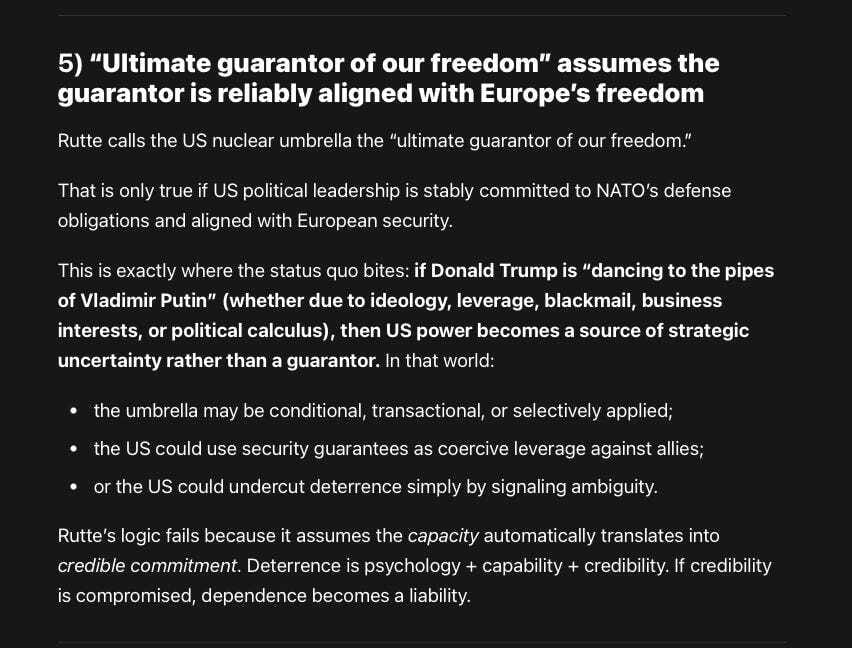 Rutte’s logic fails because it assumes the capacity automatically translates into credible commitment. Deterrence is psychology + capability + credibility. If credibility is compromised, dependence becomes a liability.