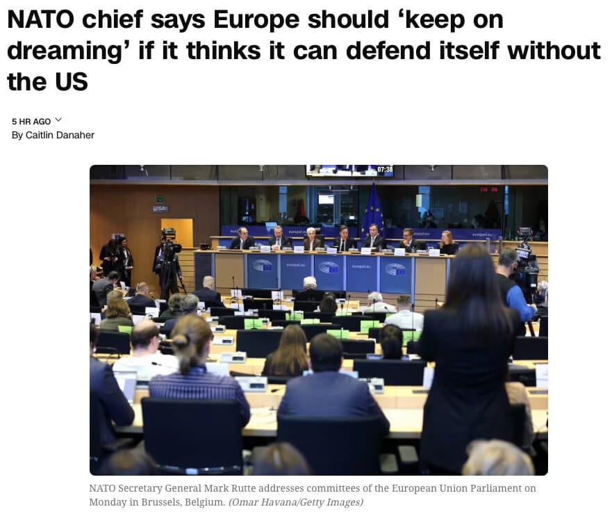 In this CNN piece, NATO Secretary General Mark Rutte delivers a blunt message to the European Parliament: Europe cannot defend itself without the United States, and anyone who thinks otherwise should “keep on dreaming.”