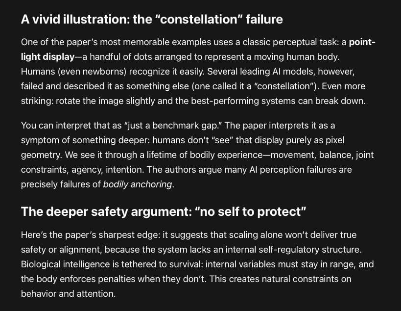 You can interpret that as “just a benchmark gap.” The paper interprets it as a symptom of something deeper: humans don’t “see” that display purely as pixel geometry. We see it through a lifetime of bodily experience—movement, balance, joint constraints, agency, intention. The authors argue many AI perception failures are precisely failures of bodily anchoring.