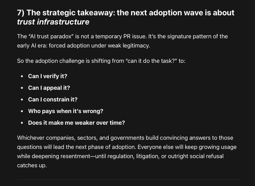 The crucial point is that trust will become a product feature and a procurement gate, not a marketing slogan. The public sentiment is basically a warning that “just ship it” adoption is reaching a social ceiling—especially once AI is experienced as coercive (jobs), extractive (data centers/resources), or corrosive (learning and thinking).