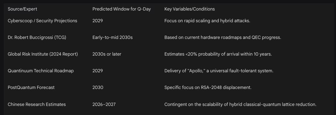 Predicting the arrival of Q-Day involves tracking progress across multiple dimensions: qubit count, error rates, and algorithmic efficiency. Current estimates for the arrival of a CRQC capable of breaking RSA-2048 range from the late 2020s to the mid-2040s.