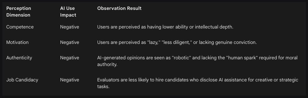 A critical deterrent to using AI for tasks related to opinions and worldviews is the “social evaluation penalty.” Comprehensive research involving over 4,400 participants demonstrates that individuals who use AI face negative judgments from others regarding their competence and motivation.4 This penalty is particularly severe when the task involves “meaning-making” or value-based output.