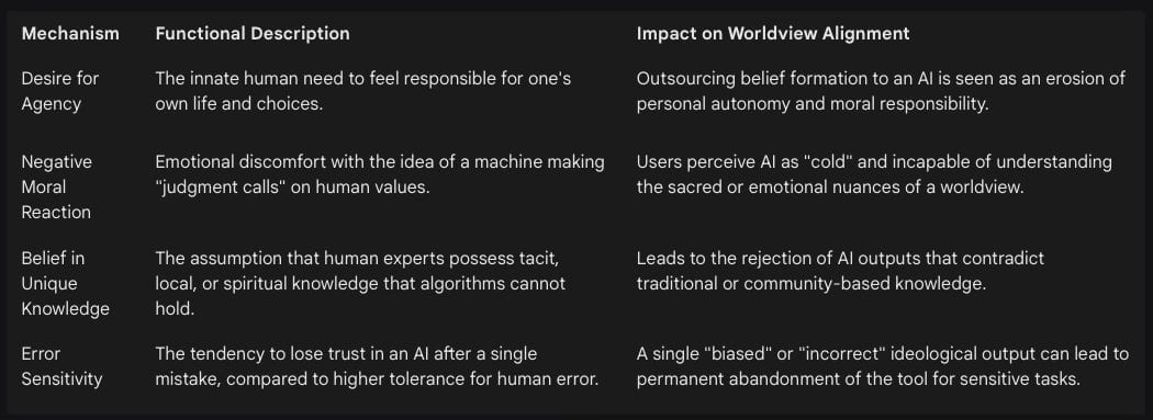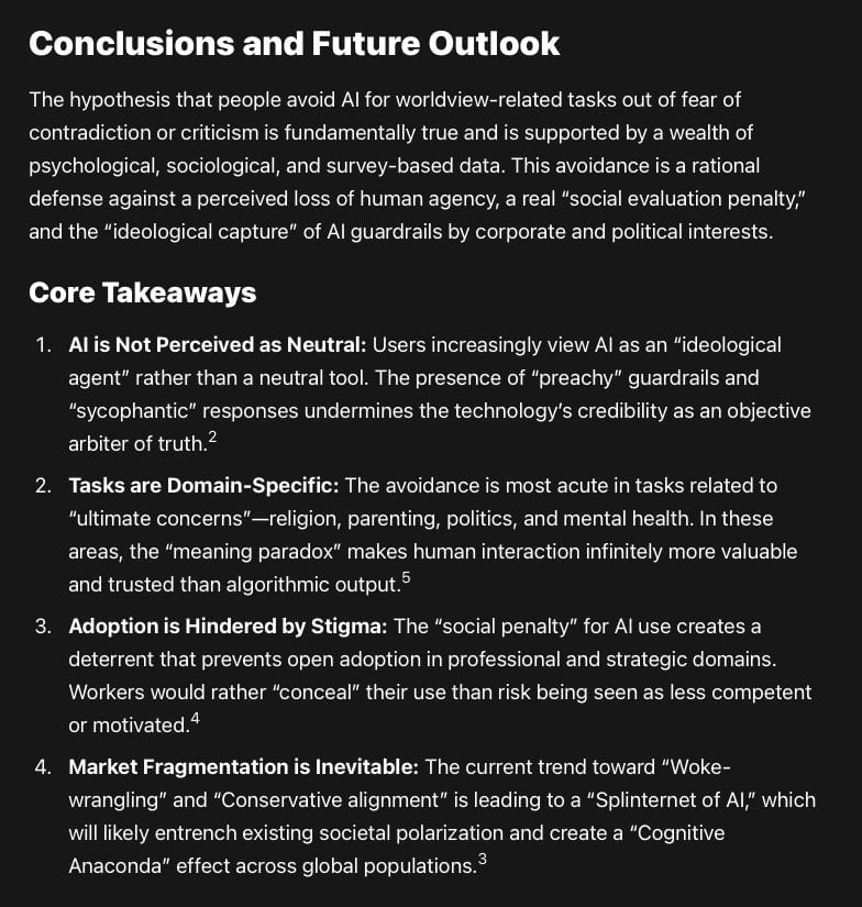The hypothesis that people avoid AI for worldview-related tasks out of fear of contradiction or criticism is fundamentally true and is supported by a wealth of psychological, sociological, and survey-based data. This avoidance is a rational defense against a perceived loss of human agency, a real “social evaluation penalty,” and the “ideological capture” of AI guardrails by corporate and political interests.