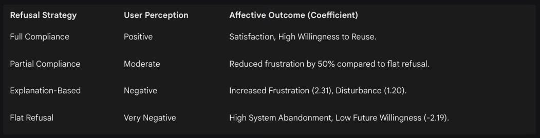 The way an AI refuses a prompt significantly influences user experience. Research into refusal strategies shows that “explanation-based refusals”—where the AI explains whyit cannot answer based on subjective safety policies—are often the most frustrating for users.8