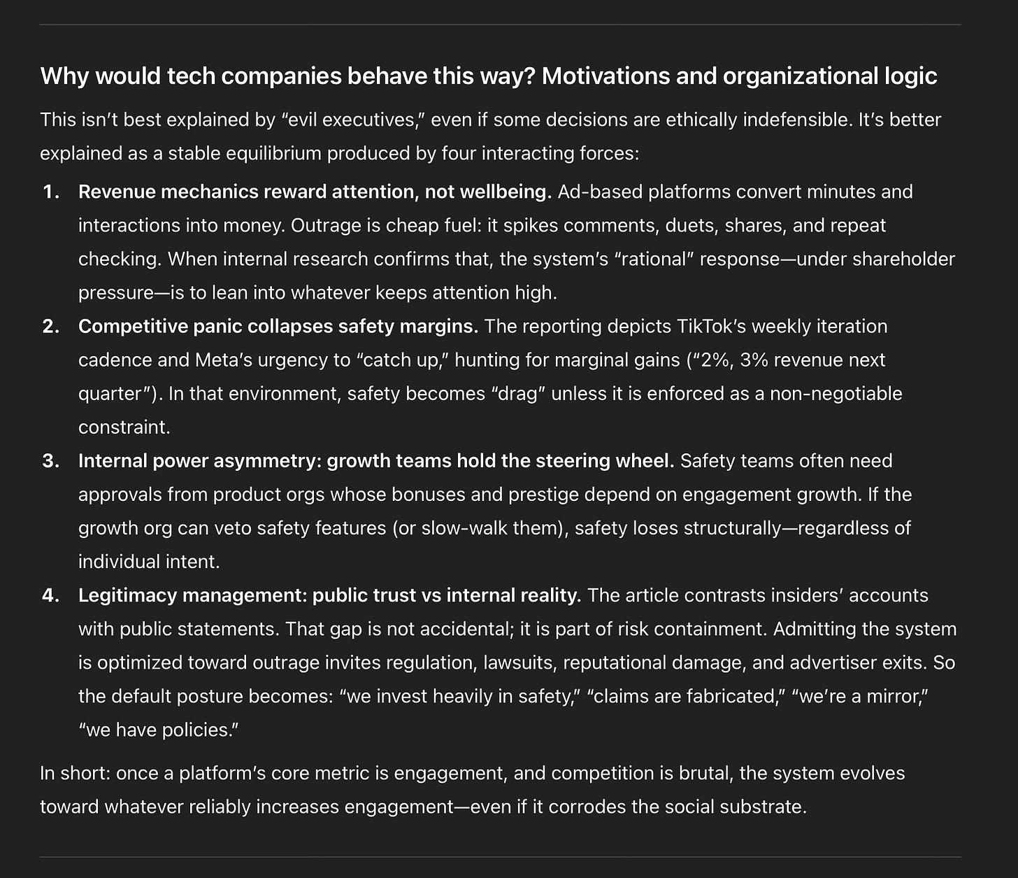Legitimacy management: public trust vs internal reality. The article contrasts insiders’ accounts with public statements. That gap is not accidental; it is part of risk containment. Admitting the system is optimized toward outrage invites regulation, lawsuits, reputational damage, and advertiser exits. So the default posture becomes: “we invest heavily in safety,” “claims are fabricated,” “we’re a mirror,” “we have policies.”