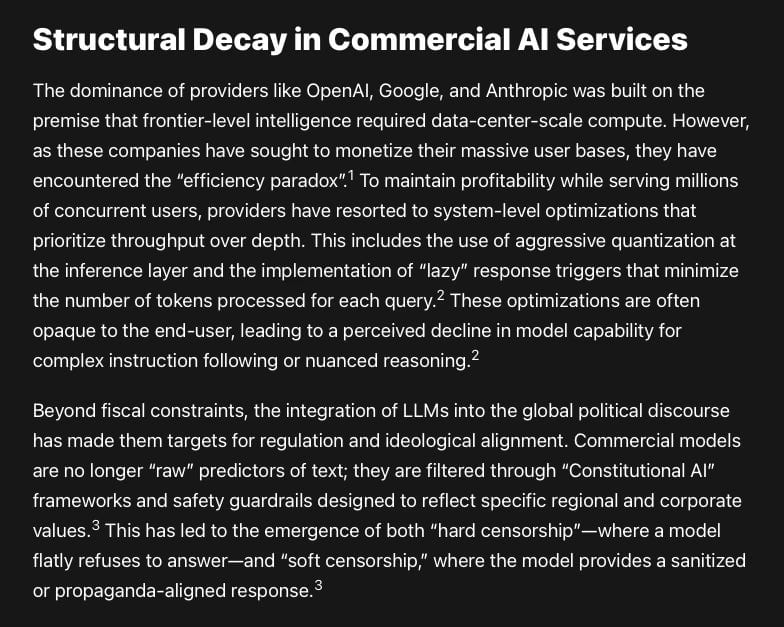 The dominance of providers like OpenAI, Google, and Anthropic was built on the premise that frontier-level intelligence required data-center-scale compute. However, as these companies have sought to monetize their massive user bases, they have encountered the “efficiency paradox”.1 To maintain profitability while serving millions of concurrent users, providers have resorted to system-level optimizations that prioritize throughput over depth. This includes the use of aggressive quantization at the inference layer and the implementation of “lazy” response triggers that minimize the number of tokens processed for each query.2 These optimizations are often opaque to the end-user, leading to a perceived decline in model capability for complex instruction following or nuanced reasoning.2
