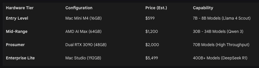 Apple’s Mac Studio and MacBook Pro offer the most realistic and simple path for running “massive” models. Because Apple uses a unified memory architecture (UMA), the entire system RAM is accessible to the GPU.14 A Mac Studio with M3 or M4 Ultra and 512GB of RAM can run models with 400B to 671B parameters, such as DeepSeek-R1, entirely in-memory—a feat that would require over $100,000 in enterprise GPU clusters.16