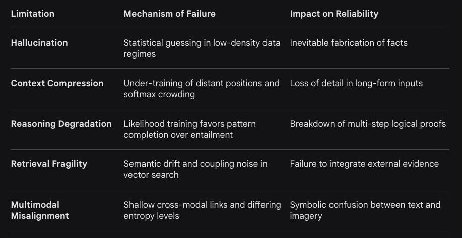 The current paradigm of artificial intelligence relies predominantly on the scaling laws of transformer architectures, where increases in model size and training data correlate with emergent capabilities. However, research indicates that these gains are bounded by five fundamental limitations: hallucination, context compression, reasoning degradation, retrieval fragility, and multimodal misalignment.2 These failure modes are not merely engineering hurdles to be overcome with more hardware but are direct consequences of the mathematical constraints of computability and information theory.2