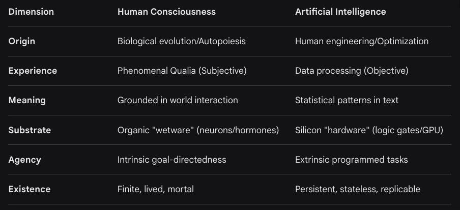 Table 2: Comparative Ontology: Human Consciousness vs. Artificial Systems
