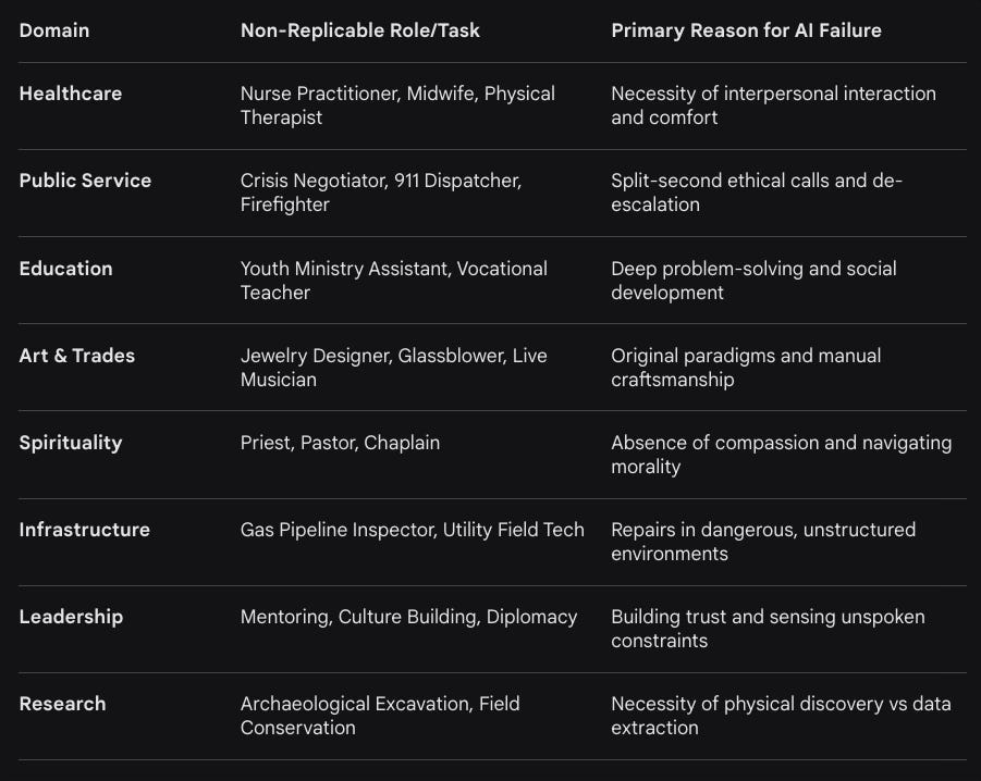 Despite the hype surrounding full automation, there are broad sectors of the economy and specific human processes that AI will absolutely never be able to replicate. These domains require moral agency, physical versatility, or the capacity for deep emotional resonance.