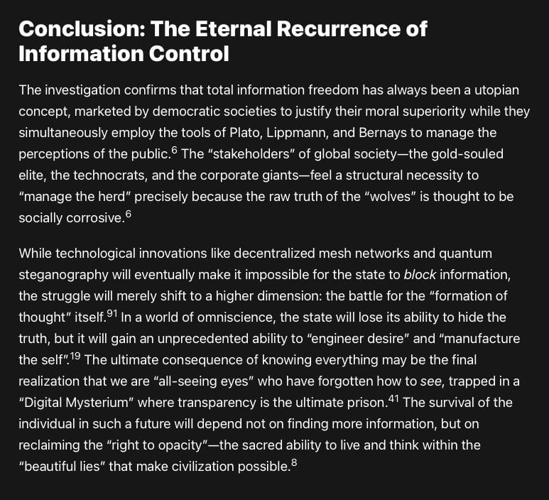 The investigation confirms that total information freedom has always been a utopian concept, marketed by democratic societies to justify their moral superiority while they simultaneously employ the tools of Plato, Lippmann, and Bernays to manage the perceptions of the public.6 The “stakeholders” of global society—the gold-souled elite, the technocrats, and the corporate giants—feel a structural necessity to “manage the herd” precisely because the raw truth of the “wolves” is thought to be socially corrosive.6