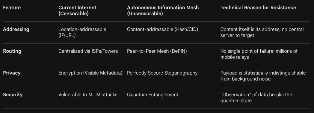 Physical Impossibility: The decentralized and mobile nature of the mesh means there is no “off switch.” Even in the event of a total internet blackout, the information continues to move through local devices via Bluetooth and Wi-Fi Direct until it finds an exit point.75