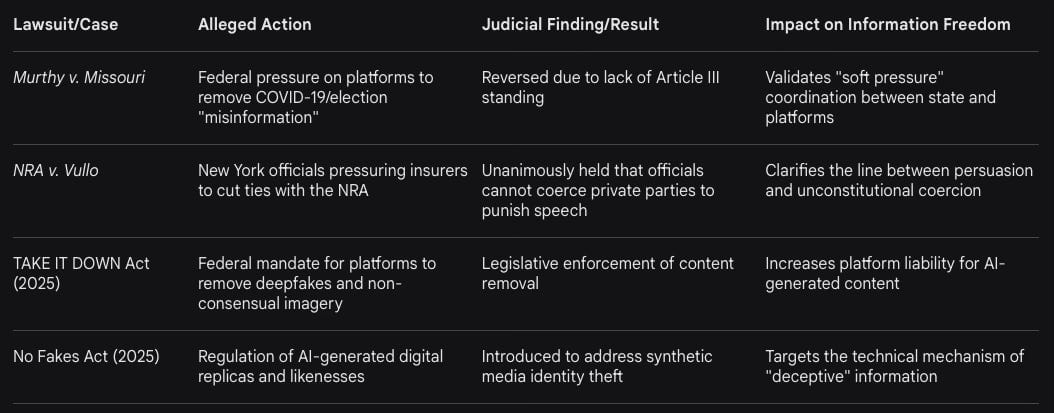 This alignment between media and government creates a “coordinated campaign” to manage public perception, particularly on sensitive topics like pandemic response, electoral integrity, and foreign policy.3 As shown in the Murthy v. Missouri litigation, federal agencies like the FBI and CISA have maintained “request pipelines” to social media companies, pressuring them to suppress speech that the government disapproves of under the guise of combating “misinformation”.2
