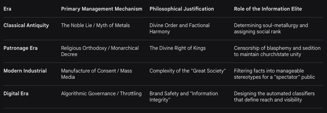 The concept of a “managed public” is not a modern deviation from democratic values but a foundational principle of Western political philosophy. In Plato’s Republic, the philosopher-king is tasked with maintaining the harmony of the state through the propagation of a “noble lie” (gennaion pseudos).6 This foundational myth was designed to ensure that citizens remained content within their prescribed social roles, effectively managing their perceptions of reality to prevent the chaotic “sparring” of factions that leads to the dissolution of the city.8