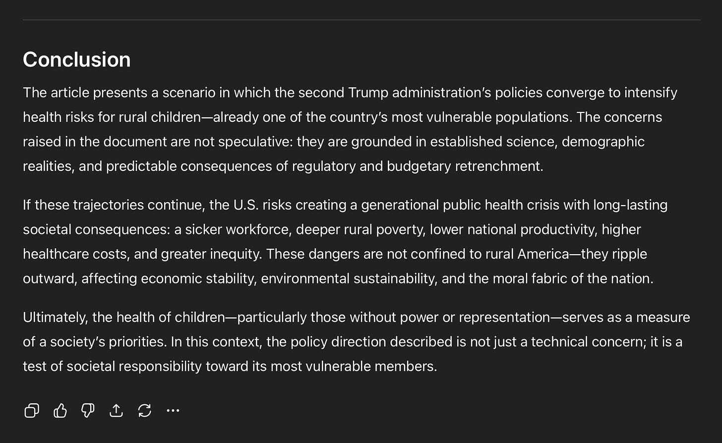 The article presents a scenario in which the second Trump administration’s policies converge to intensify health risks for rural children—already one of the country’s most vulnerable populations. The concerns raised in the document are not speculative: they are grounded in established science, demographic realities, and predictable consequences of regulatory and budgetary retrenchment.