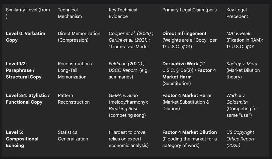 The author proposes a 5-level “spectrum of similarity” to categorize these outputs, ranging from high n-gram overlap (Level 1) and paraphrase (Level 2) to stylistic (Level 3) and structural (Level 4) reproduction.1 The central claim is that all of these levels can functionally substitute for the original work, even if they are not direct copies. For example, a generated image “in the style of” an artist (Level 3) competes for the same market as that artist’s commissions. A generated code snippet (Level 4) competes with the licensed code library it was trained on.
