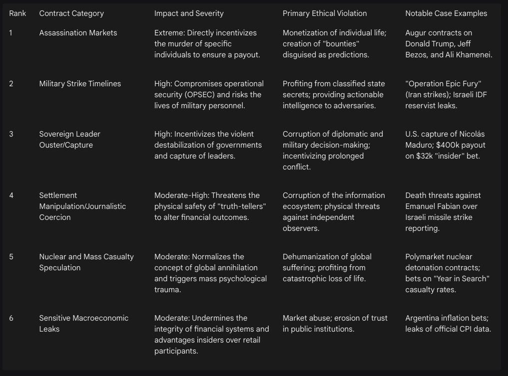 To understand the ethical landscape of modern prediction markets, it is necessary to categorize and rank wagers based on their potential for real-world harm and the degree to which they violate established moral norms. The following ranking assesses bets on two primary axes: the severity of their unethical nature (the degree of moral transgression) and their real-world impact (the potential for causing physical harm, security breaches, or institutional collapse).