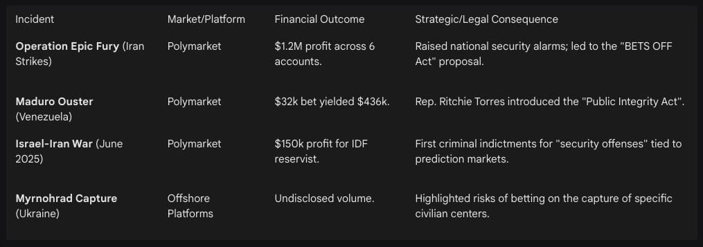 Military strategy relies on the element of surprise. Prediction markets effectively “liquidate” this surprise by reflecting non-public knowledge in the form of price movements.18 In early 2026, during the U.S. and Israel-led strikes on Iran (Operation Epic Fury), blockchain analysis identified a cluster of six wallets that earned over $1.2 million by betting “YES” on the timing of the strike just hours before it occurred.11 These accounts were funded specifically for this trade within 24 hours of the event, suggesting they were controlled by individuals with “inside knowledge” of President Trump’s military decisions.20