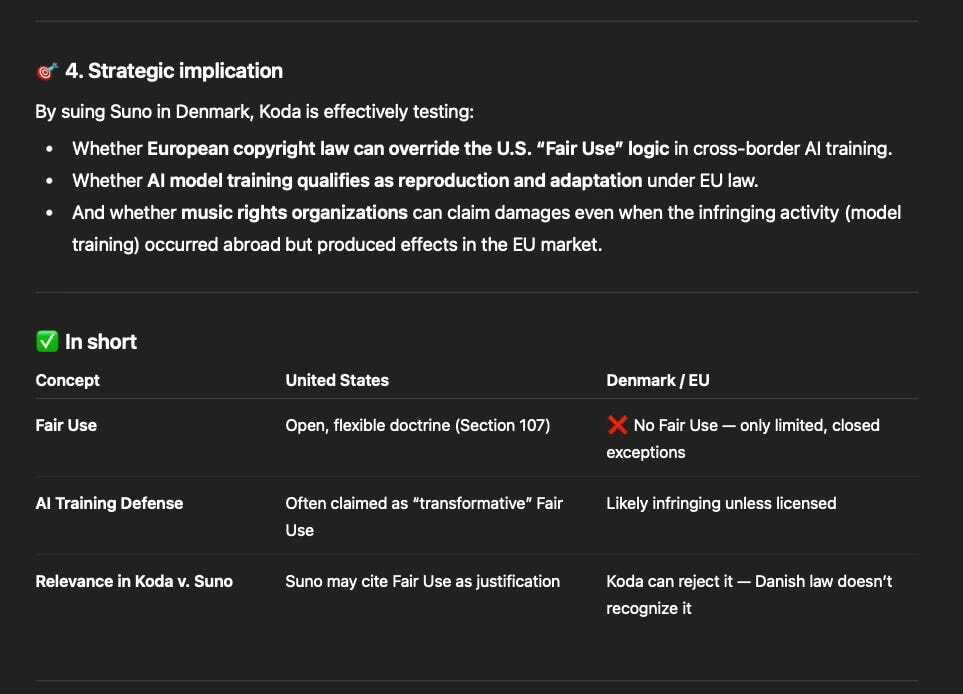 Even though Denmark lacks Fair Use, it’s relevant because Suno is a U.S.-based company. Its defense strategy will likely rely on the same argument used in the ongoing RIAA v. Suno and Udio cases in the United States — that ingesting copyrighted material for model training constitutes transformative use and is therefore Fair Use under U.S. law.